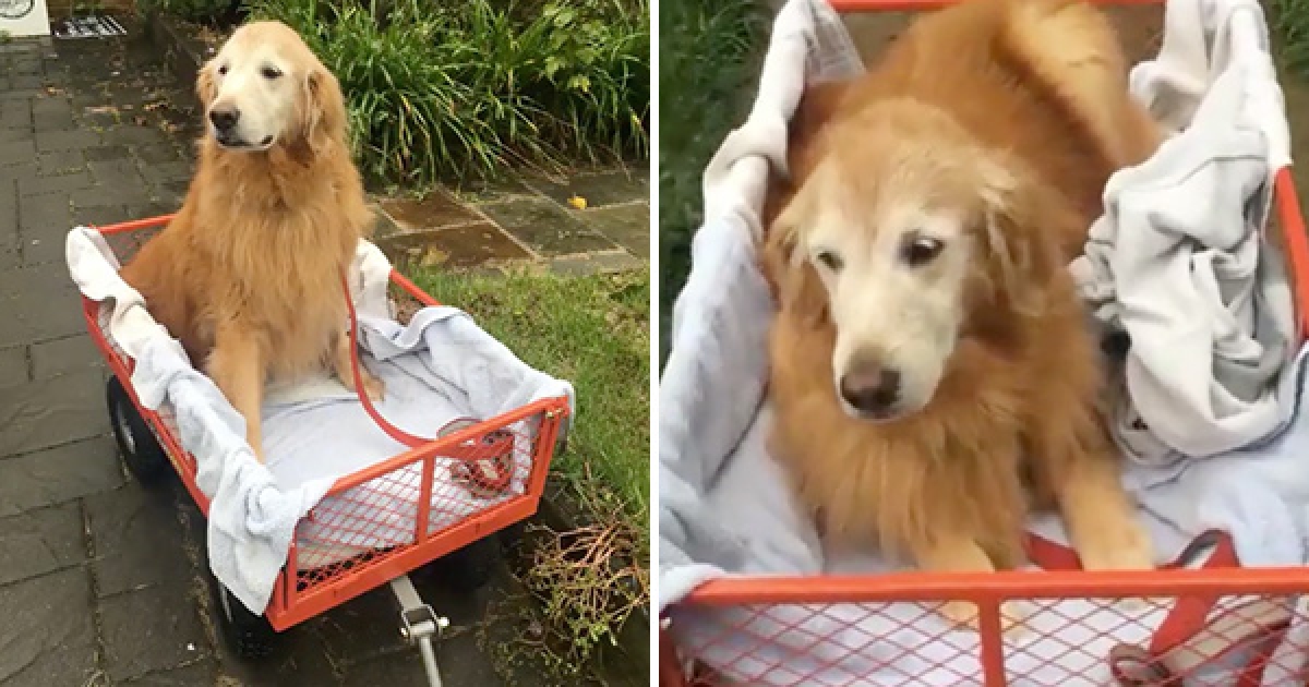 狗老了就拋棄牠? 主人為金金買小車推散步 以行動告訴牠:我們永遠是家人