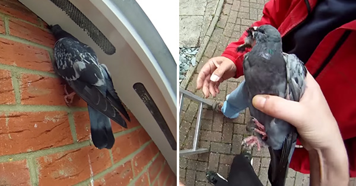 鴿子被夾在屋簷中 救援英雄「爬驚悚高梯」鬆雙手拔下牠