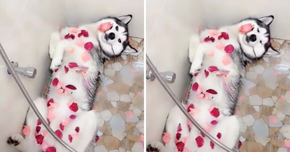 哈士奇嘴叼玫瑰洗花瓣澡 眯眼享受:怎樣,沒看過貴妃沐浴?