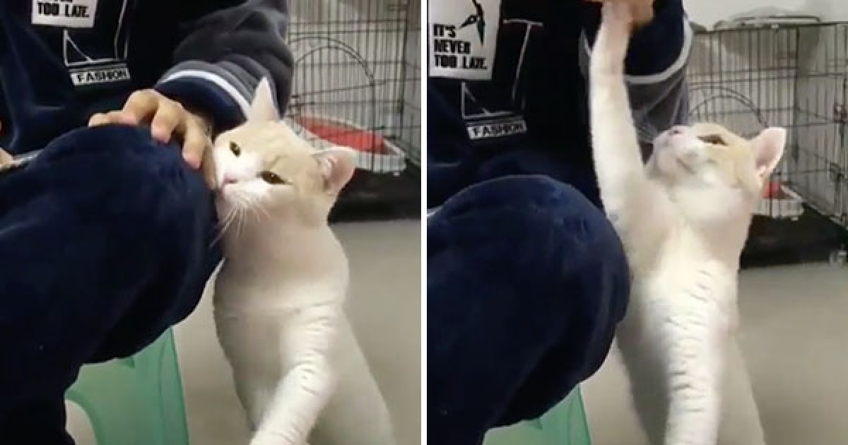 高冷喵皇「頭靠大腿」暗示討摸 見奴才不來忙伸爪:快來伺候我!