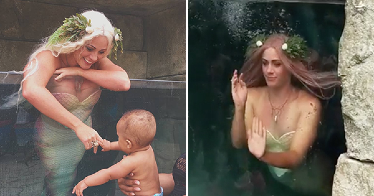水箱裡關了活的美人魚! 長髮飄飄甜送飛吻 孩子夢想都成真了