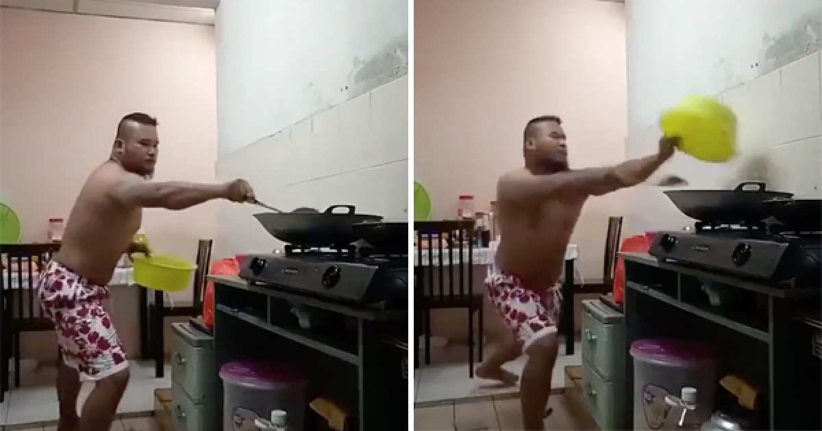 壯漢下廚就變小孬孬 料一丟「閃超遠」:不會爆炸吧?