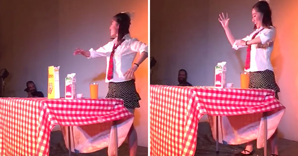 女子神模仿機器人吃早餐 柳橙汁喝下去「短路反應」笑翻全場觀眾