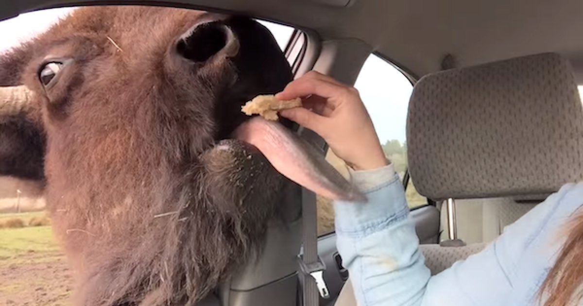 女子餵窗外水牛食物 牠頭伸進車窗「獻吻答謝」