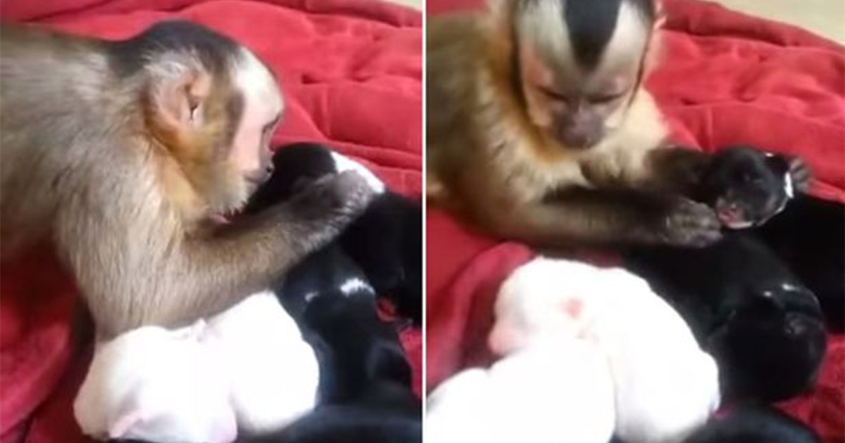 這隻猴子看到一群狗寶寶瞬間被融化 溫柔幫抓癢癢畫面超有愛