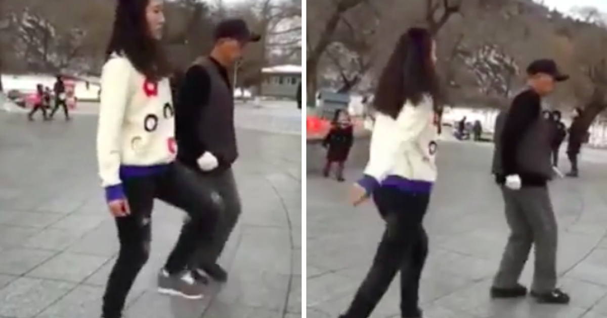 年輕女孩和爺爺一起跳廣場舞 兩人配合默契堪稱「最強搭檔」