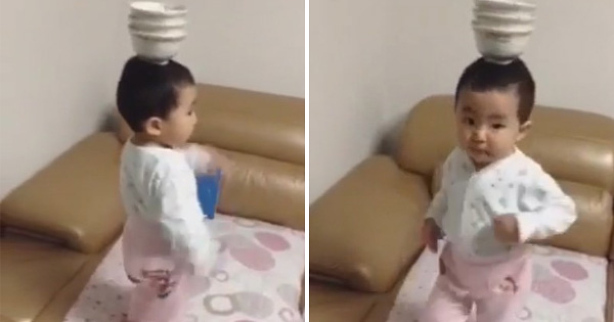 小男孩在床上跳「頂碗舞」 3個碗穩穩在頭上都不會掉