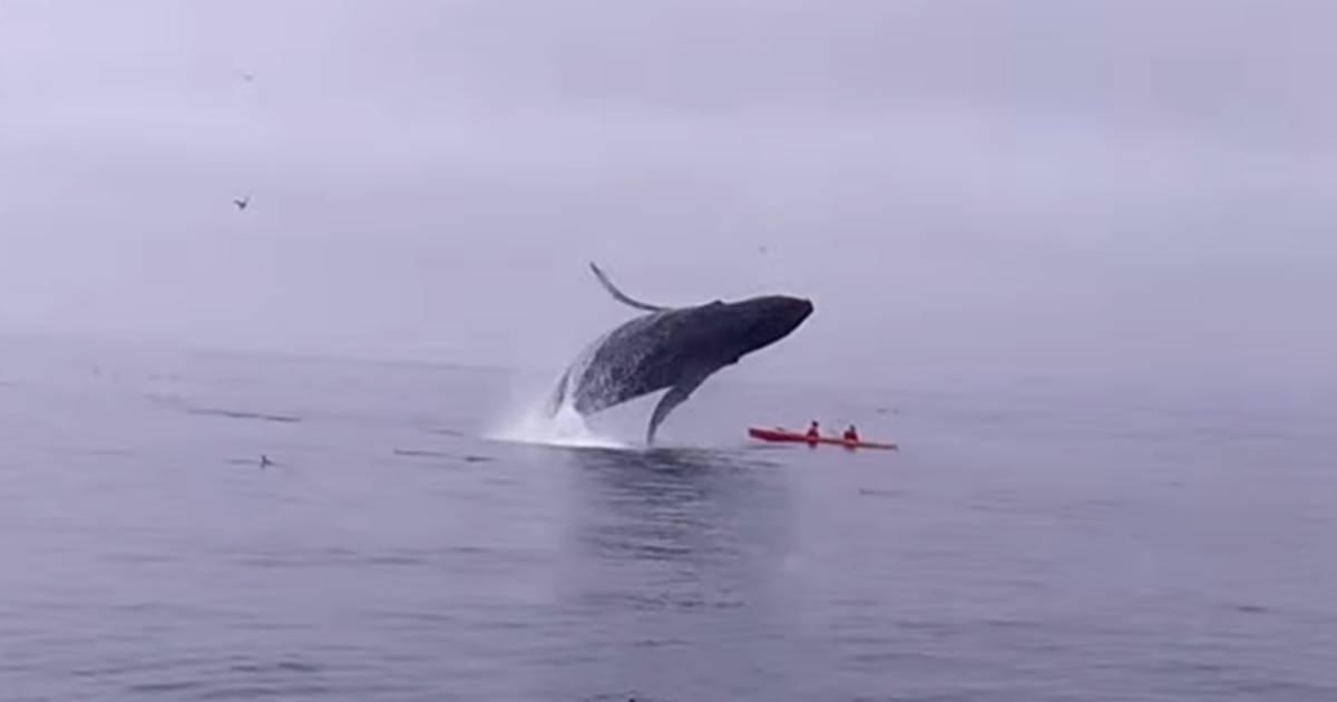 划船賞鯨突遇座頭鯨躍出海面 沒想到下一秒座頭鯨就從頭頂壓下來