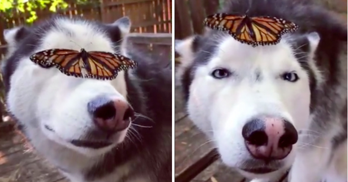 蠢萌哈士奇被蝴蝶爬上頭 呆住不敢動:馬麻救命啊!
