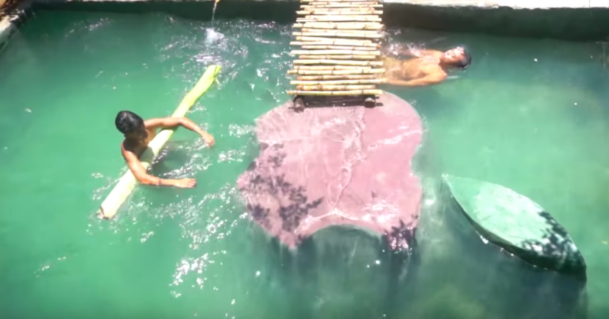 他們在野外挖泳池泡澡消暑 還引入溪水太清涼