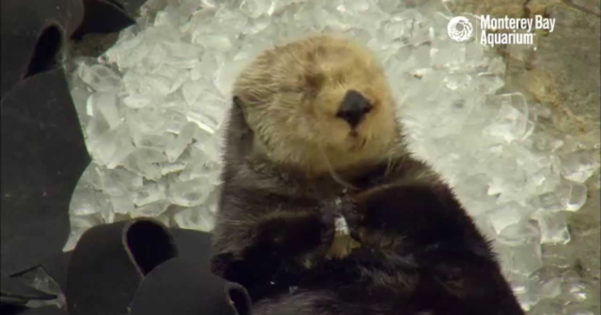海獺收到冰塊開心敲敲敲 一臉滿足嗑下去:這零嘴好好吃~
