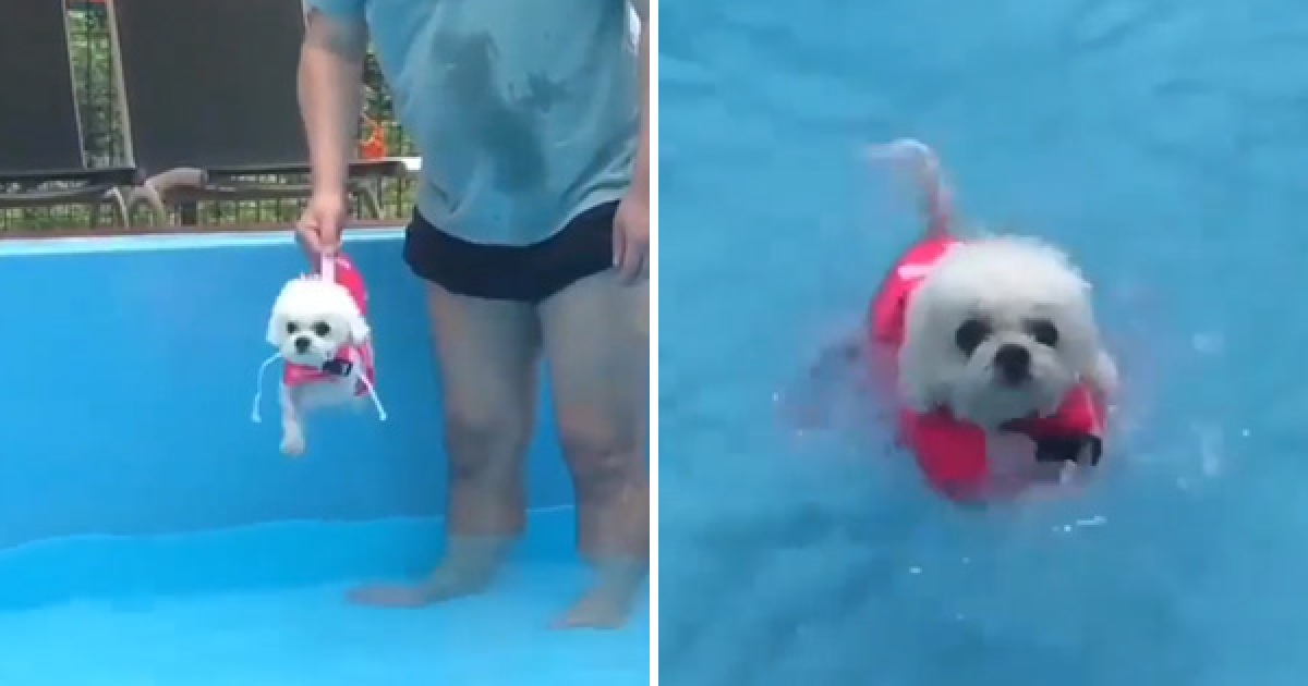 馬達準備好了! 小白狗下水前瘋狂空踩 得意游泳:阿母~我成功啊!