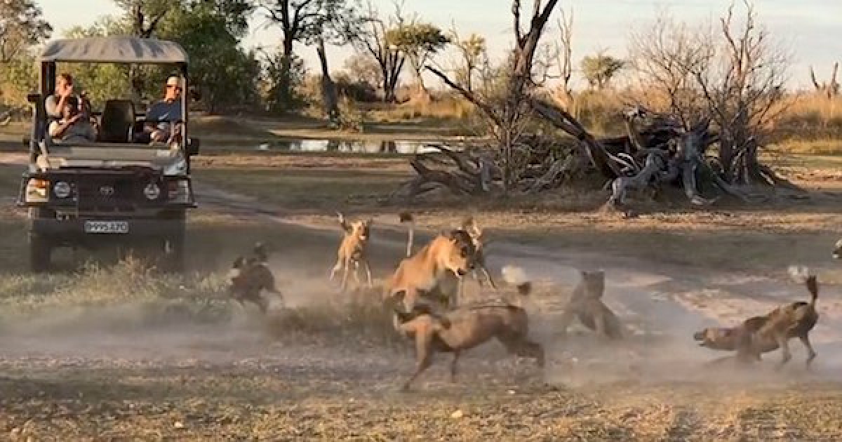 獅子母子被飢餓野狗包圍 媽媽「力戰全部」讓小獅子逃跑