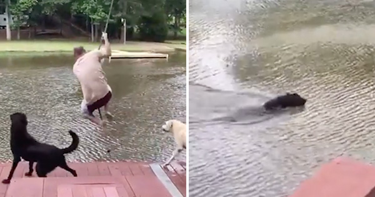 主人玩跳水嚇壞狗狗 黑狗急哭:把拔別怕,我來救你了!