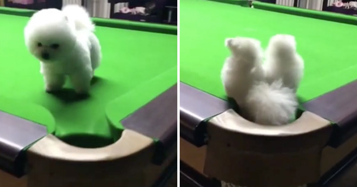 小博美在撞球桌上「一桿進洞」 身體卡住腳腳還在動超可愛