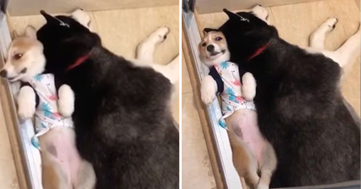 柯基一大早「驚恐求救」 被身旁哈士奇壓好扁:眼睛都凸了