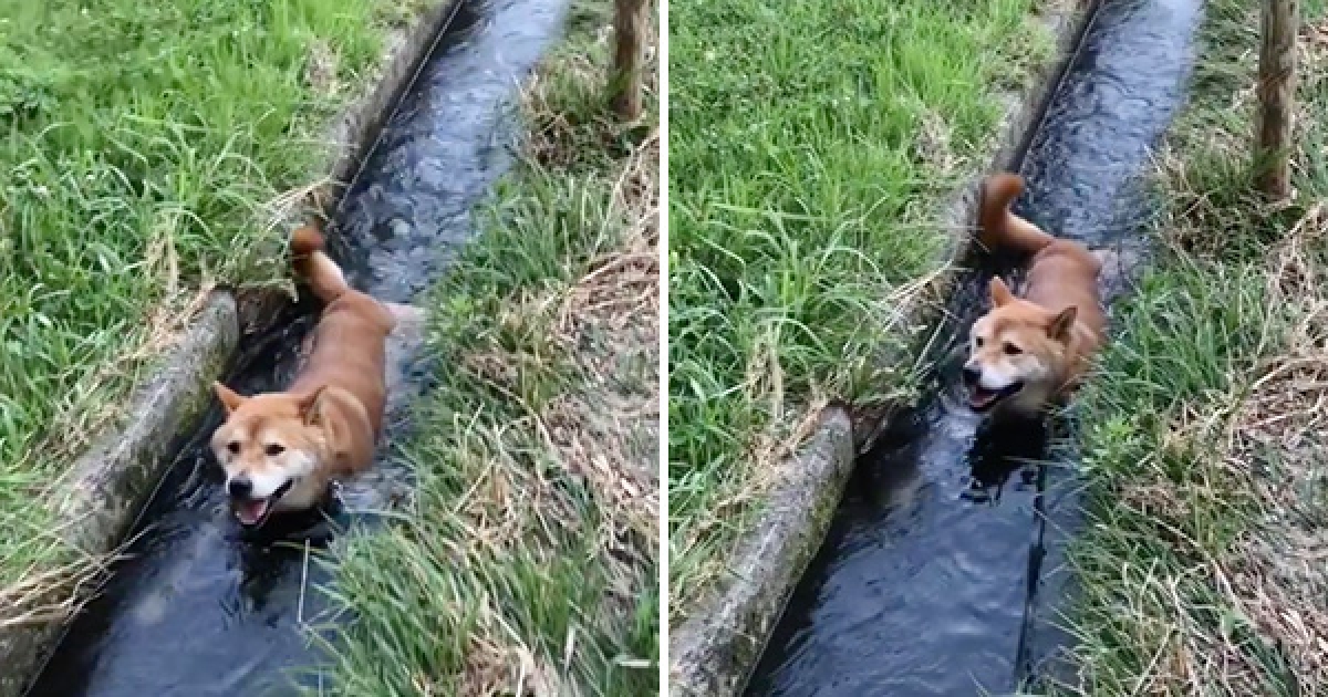 柴柴跳進水裡一臉「好蘇湖」 慢慢跟著水流走還對鏡頭燦笑:Bye~