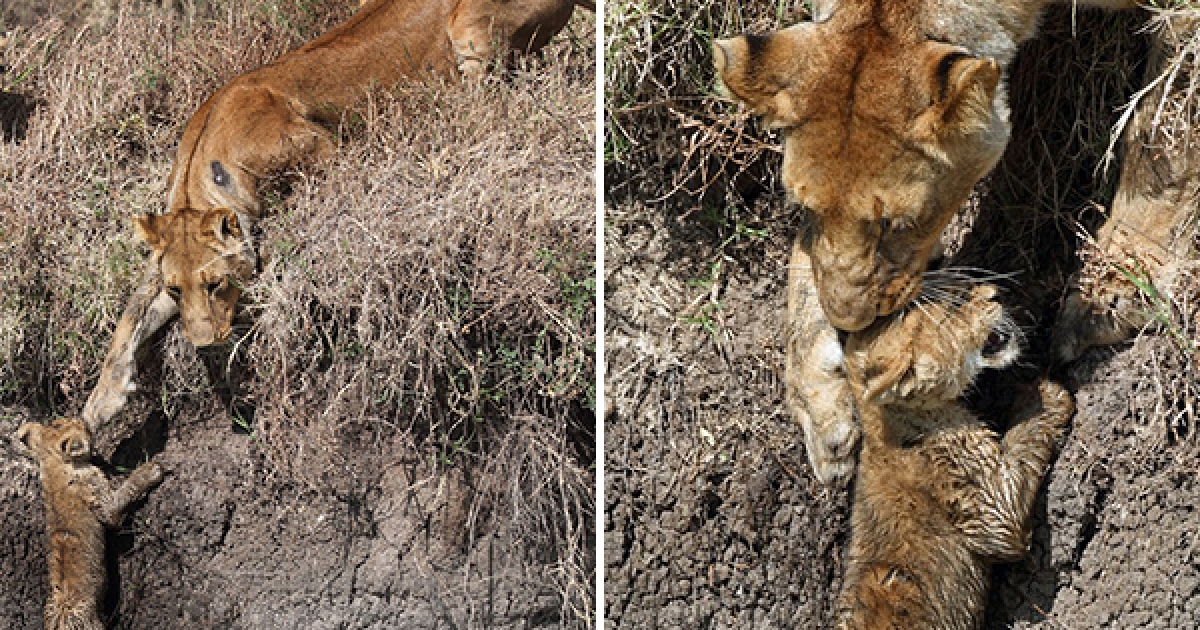 小獅子過河「陷泥堆」緊張往上跳 母獅忙伸手:寶貝抓住我!