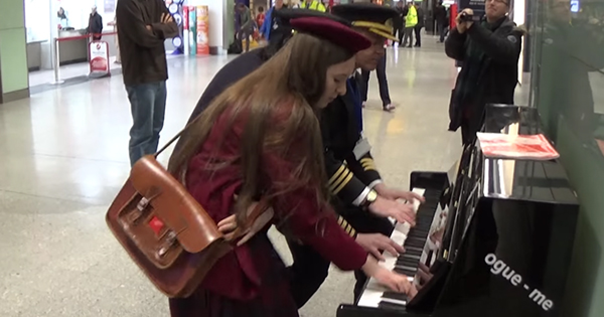 女子在等飛機時看到鋼琴就隨手彈一彈 機長經過也加入「6手聯彈」超熱血