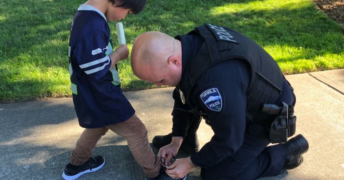 看小孩赤腳跑怕他受傷 「害羞警官」急買鞋跪地為他穿上