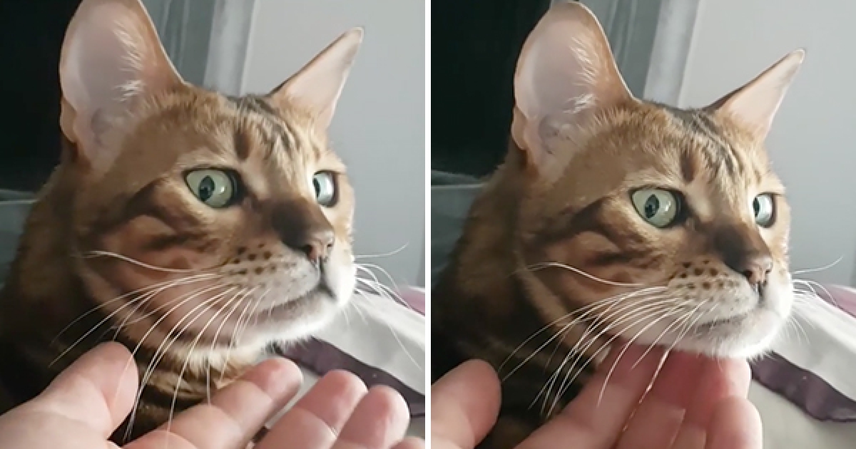 「才沒有舒服呢!」 豹貓被挑逗一臉高冷 下巴變戽斗露餡