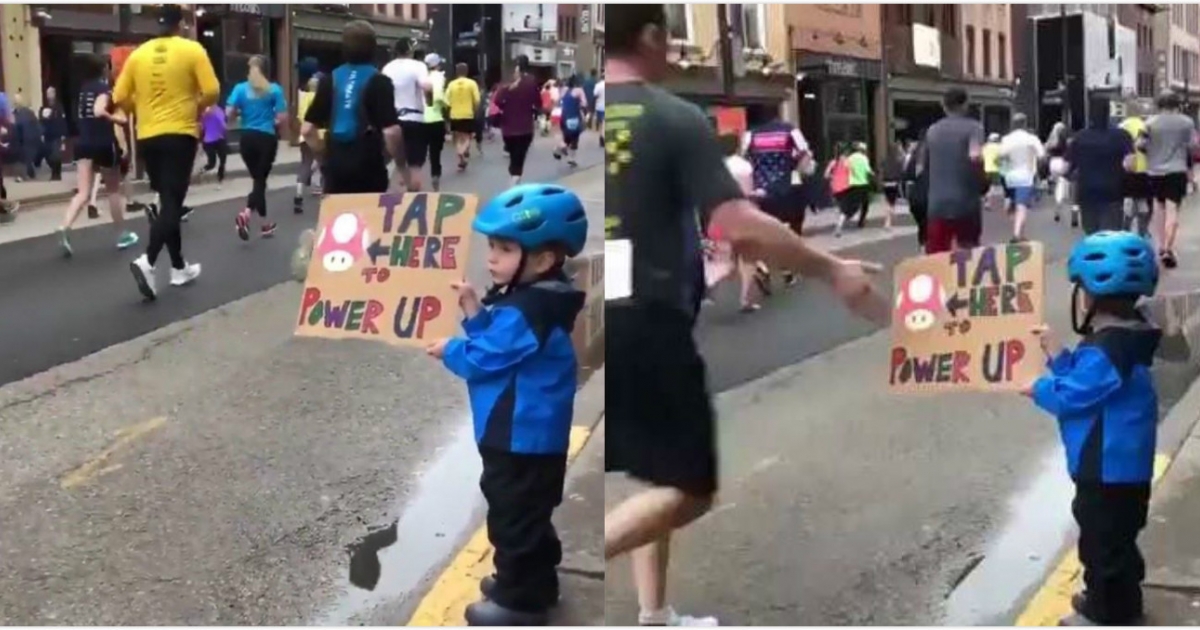 小男孩舉牌站路邊 馬拉松選手「都跑去碰」就為了補充能量