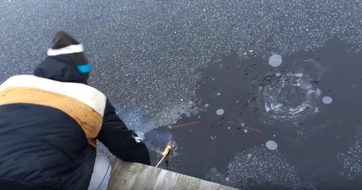 冰釣途中一時興起把衝天炮放入結冰的湖面 最後「轟」的一聲所有人都驚呆了