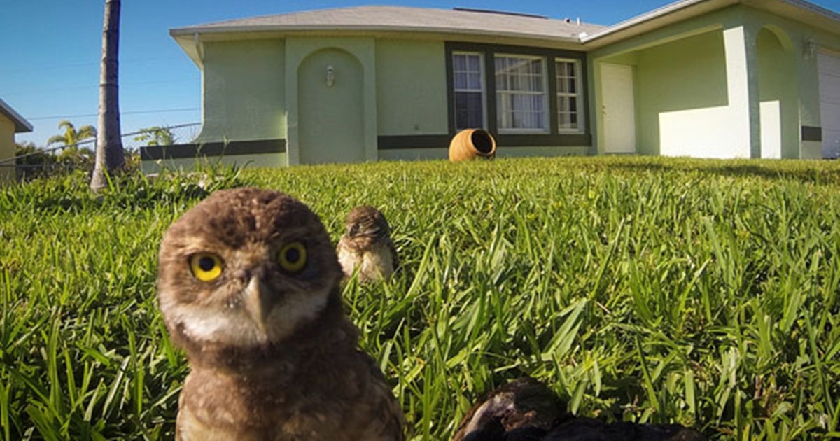 兩隻貓頭鷹在草坪上看到攝影機超好奇 對著鏡頭呆萌跳舞太可愛了