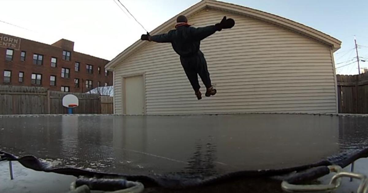 寒冬天他在彈翻床上灑幾層水 一跳上去華麗特效爆紅網路