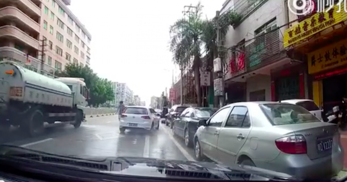 情侶遇到洗街車無處躲避 默契「超級瑪利歐式跳」完美閃過水柱