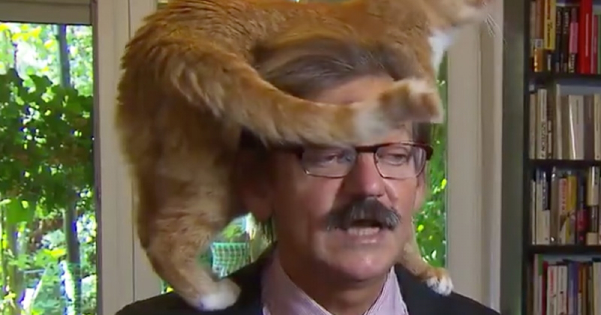 博士認真受訪 調皮貓爬上肩「尾巴故意擋臉」撒嬌:理我嘛~喵
