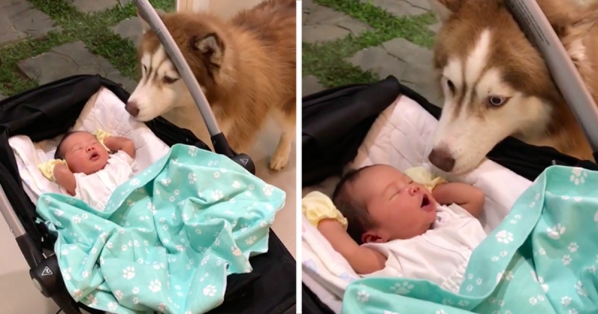 哈士奇靠近小寶寶狂聞 超有愛眼神像是在說:我會守護你長大