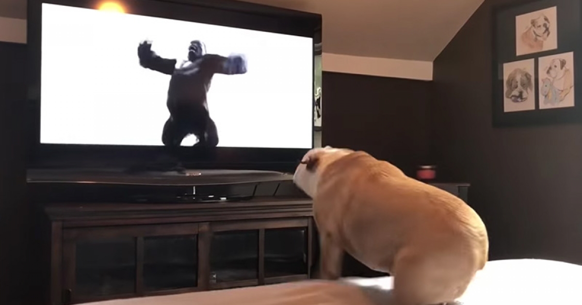 鬥牛犬超認真在看《金剛》 「英雄救美」瞬間牠竟然跳起來歡呼