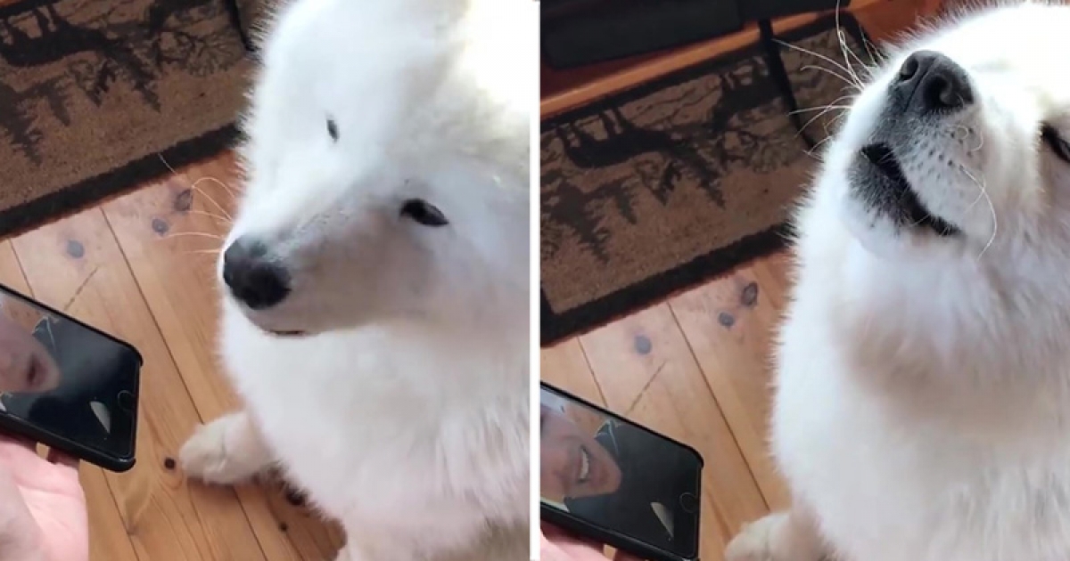 薩摩耶太想念出差的爸爸 一看到視訊裡的把拔秒嚎叫:我好想你~
