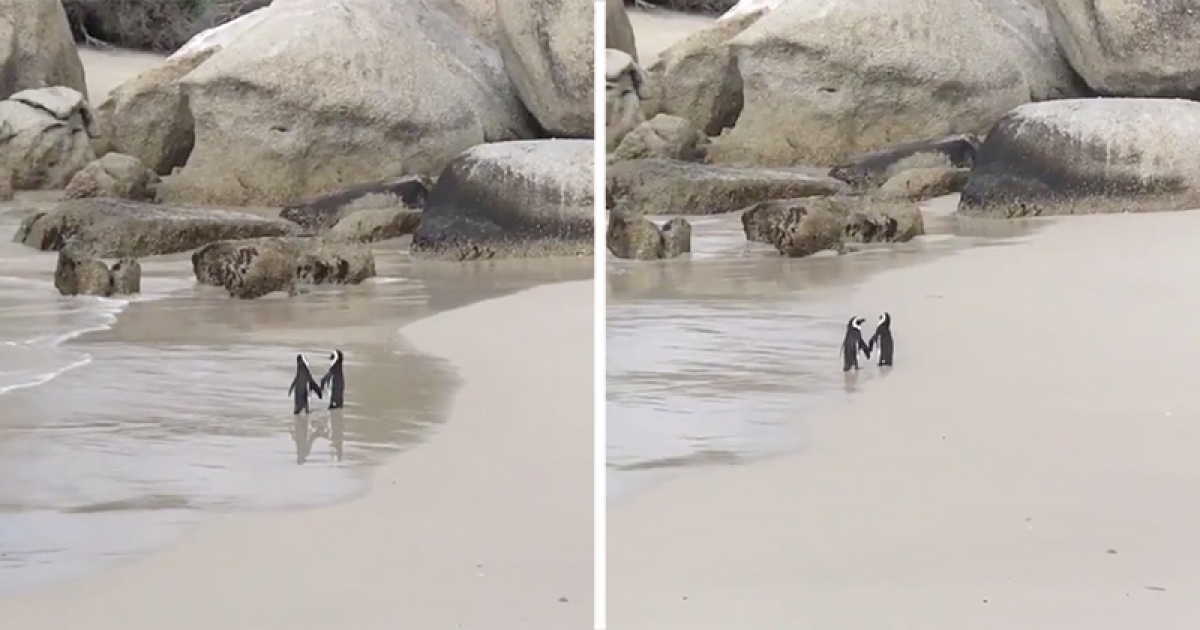 企鵝在沙灘「手牽手」閃瞎單身狗 網友哀嚎:連企鵝的愛情都比我好