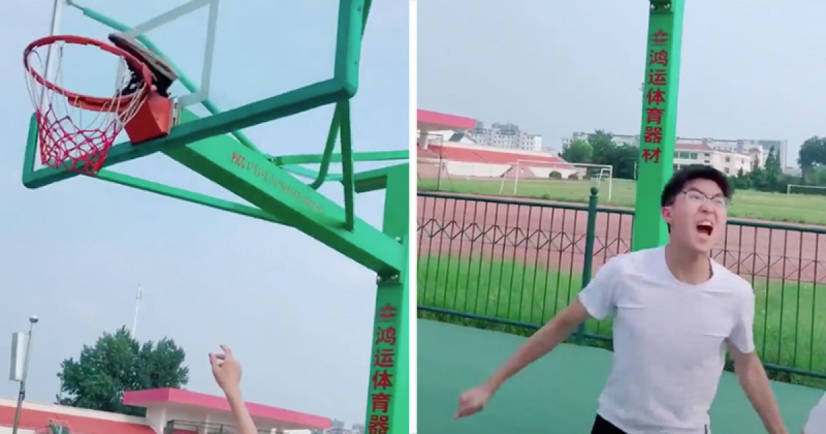 想用另一隻鞋子解救卡在籃框的鞋子 結局卻「衰到爆」讓他仰天哀嚎