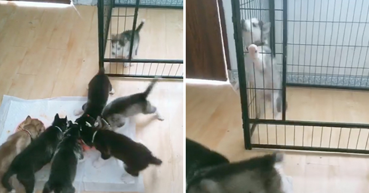「為什麼牠們能吃到食物?」 小二哈心急狂吠 沒發現旁邊就有出口